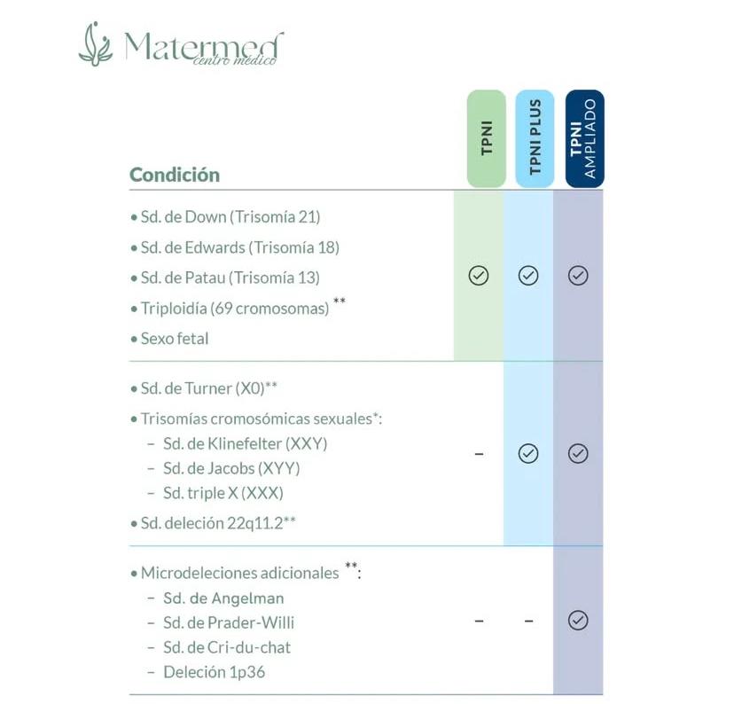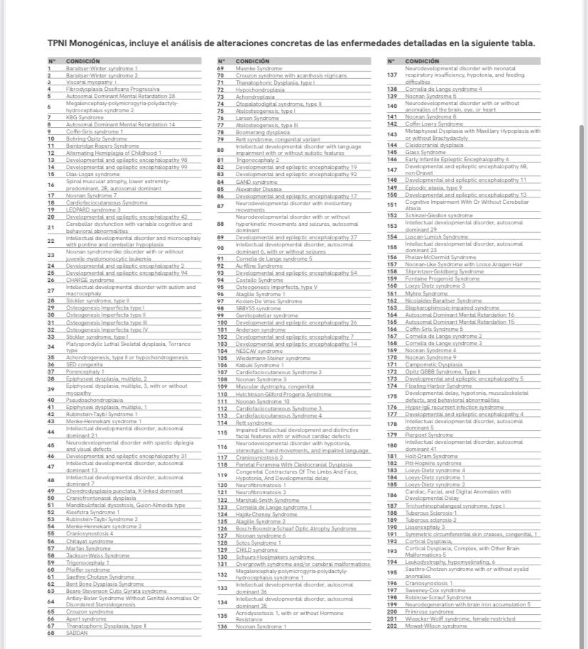 | Condición | TPNI Especiales | TPNI Especiales PLUS | TPNI Monogénicas |